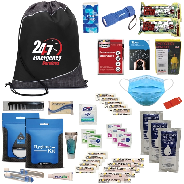 Get more people to show interest in what you can do when you offer this 1-person, 3-day emergency kit! In a cinch bag comes US Coast Guard recommended rations of water and food bars as well as a Dorcy 100 lumen C.O.B. flashlight, poncho, emergency blanket, emergency guide, first aid, and hygiene packs. Stash it in your car or a safe place at home to always have it nearby in case of an emergency. Add your company name or logo for maximum visibility and offer at the next safety-related event for a great response. Make your brand much more visible for marketing success!