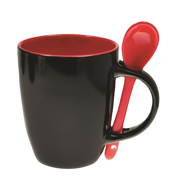 Enjoy your morning coffee with a spoonful of your favorite sweetener or condiment with this bistro-style mug and spoon set. This 3.18″ x 4″ 12-ounce ceramic mug has a specially designed slotted handle that holds the matching included spoon. Each item is individually polybagged and carefully packaged with egg-crate material for safety. Add your organizational or company emblem, logo or message to this generous mug to create an eye-opening caffeinated gift or giveaway from a coffee shop, diner, grocery, or supermarket.