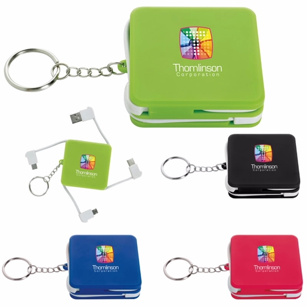 2.125″ x .625″ x 2.375″ 3-in-1 ABS charging USB charging cable and keychain.
