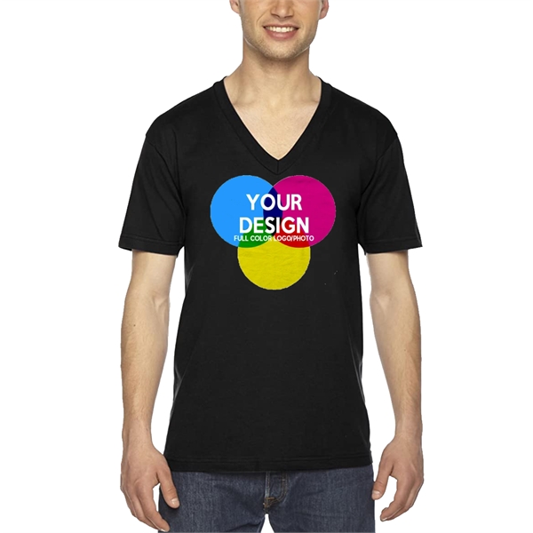 Get customers excited this summer with our 3-Piece Low Min American Apparel Full Color Men’s V-Neck Cotton T Shirt with Full color DTG imprinting. This V-Neck T-shirt is ideal for sports & outdoor activities and features a large imprint area of 12.00″W x 12.00″H as well as on left/ right chest, ideal for Maximum Brand exposure. It is made of 4.3 oz. 100% Combed Ring-spun Cotton. With 30-single for extreme comfort, this trendy t shirt also feature Shoulder-to-shoulder tape. Order these Tshirts today and promote your brand like never before!