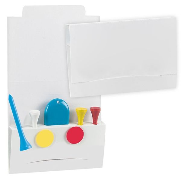 Create a swinging branded promotion for your next corporate or charity golf tournament or other themed event with the 4-2-1 Golf Tee Value Pak! This 1/2 x 3 7/8 x 3 paper holder looks like a pack of matches and contains four 2 1/8 wooden golf tees, two plastic ball markers and a divot repair tool — all at a price that’s kind to your budget and bottom line. Add your school, sports team, organizational or company logo or message to create a cool gift or giveaway from a favorite course or pro shop. Made in the USA.