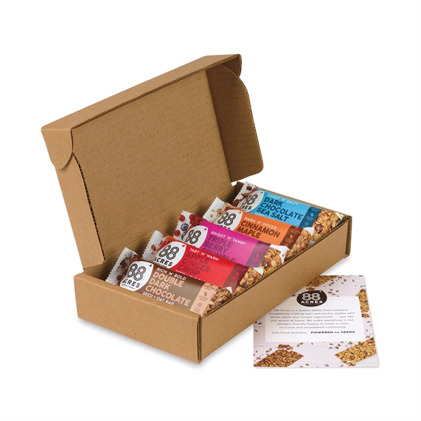 Inside our reusable cotton gift bag is this gift box containing five wholesome and delicious 88 Acres® nut-free seed bars.