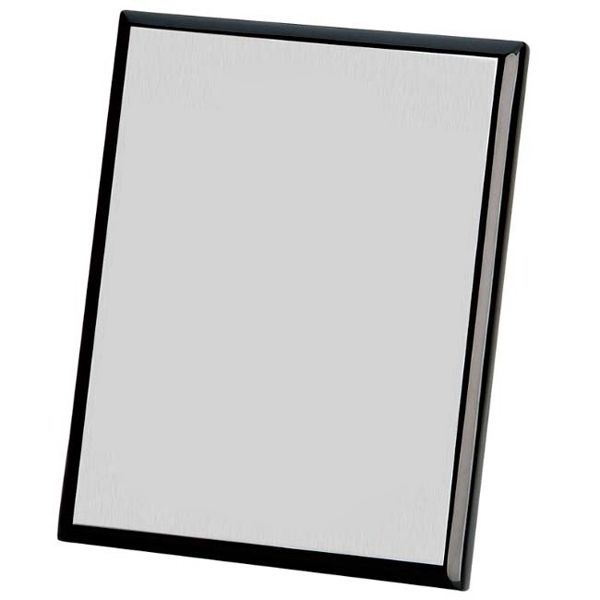 8 x 10 black plaque with silver plate and polished brass loop stand; can be displayed via wall mount or stand-alone.