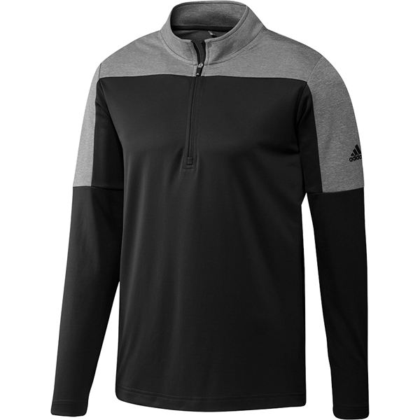 Adidas Lightweight UPF 1/4 Zip. Regular fit. Half zip with stand-up collar. Soft, stretchy feel. Lightweight layering golf tee. Colorblocked. 50+ UV factor.