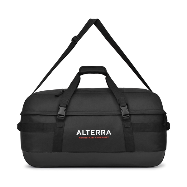 Dual zippered opening to main compartment. Clamshell style opening to main compartment. Top interior compartment with a zippered mesh divider. Mesh slip pocket in interior. Quick-access top zippered pocket. Exterior rain flap helps protect your belongings. Dual side grab handles. Tarpaulin base is durable and easy to clean. Trolley strap feature slips over luggage handle. Adjustable, removable shoulder strap. Dual carry handles with padded handle wrap. Front buckles bear the weight of your bag.