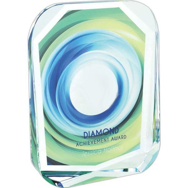 Recognize a come from behind sporting victory, sales goal conquered, works in public service or dedicated years spent pursuing a profession with these handsome awards and honors. This 4 7/8″ x 6 1/4″ x 1 1/8″ optical crystal has a freestanding design with beveled corners. Available in translucent or opaque construction. Add your school, sports team, organizational or company logo or message to create a dynamic presentation certain to be treasured for years to come.