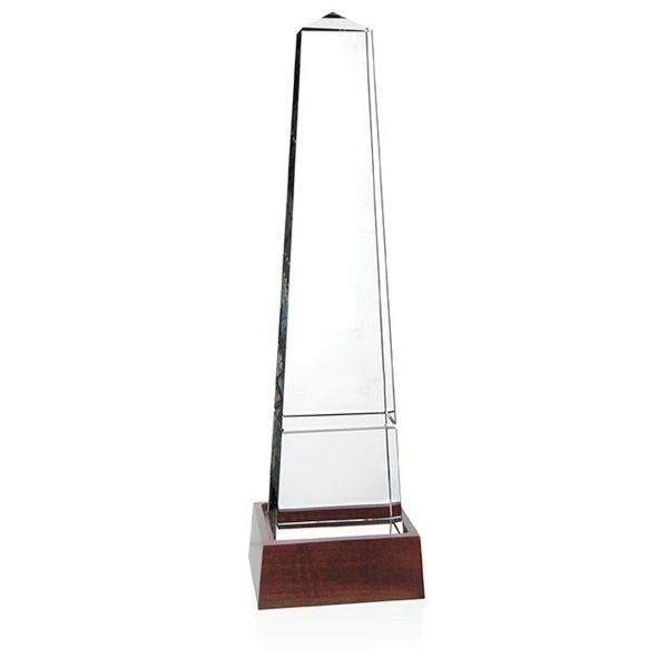 Obelisk shaped award made of optical crystal with a wooden base and customization.