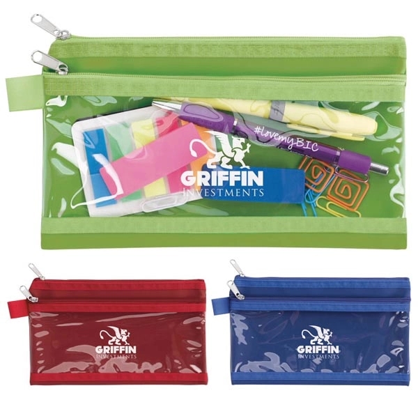 Head back to school with all of your gear in tow with this cool and color pen and pencil pouch. This 8 1/2″ x 5″ x 3/8″ zippered case is made of PVC with a dual compartments and colored backing. The fabric loop makes it easy to attach to a binder, keychain, backpack or briefcase. Choose from three colors and add your school, sports team, organizational or company logo or message to create a promotional giveaway for marketing and social activities and events.