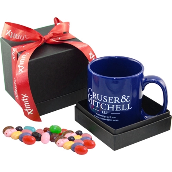 This gift box filled with an 11 oz. mug and delicious Jelly Bellies is a great way to reward your top employees or say thanks to clients. Both items are professionally presented inside a beautiful ribbon-wrapped black box. Each mug is microwavable and hand-wash recommended. Add a one color imprint to the mug and/or ribbon to showcase a brand name, logo or message. Multiple color options are available for the mug and ribbon.