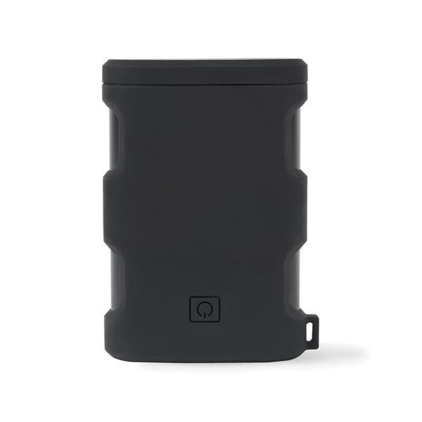 6,000 mAh power bank with integrated LED light, carabiner, USB recharging cord and gift box.