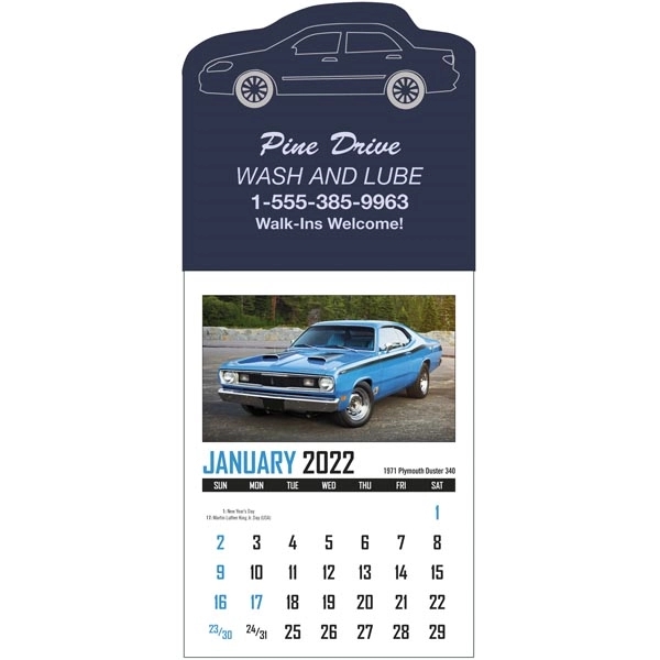 You can almost hear the roar of the engines when you stick this high-octane muscle car calendar to your wall or desk. This 2022 calendar is 3 x 6 and with a vinyl adhesive piece and 12 tearaway monthly pages. Choose from 22 mount shapes, nine vinyl colors and 13 foil colors to create a custom look for your calendar. Add your school, sports team, organizational or company logo or message to create a fast-paced branded giveaway that will keep your brand in the spotlight all year long.