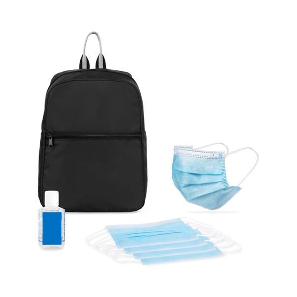 Ready to Go PPE kit with Moto Mini backpack with five single-use face masks and two-ounce bottle of hand sanitizer.