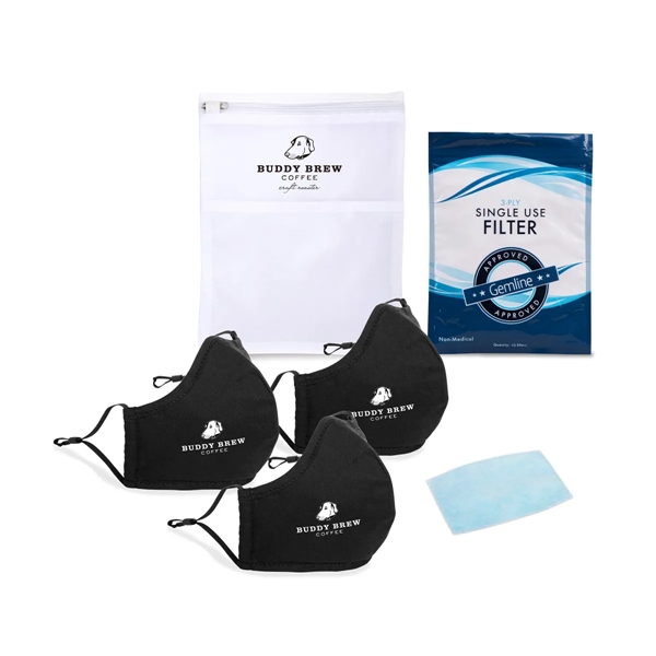 The essentials you need to be prepared. The Reusable Face Mask Wash Bag is combined with three Reusable Face Masks and one pack of 3-ply Single Use Filters. A convenient way to launder your reusable face masks, the Reusable Face Masks and Reusable Face Mask Wash Bag are both washable! Kit contains: One Reusable Face Mask Wash Bag. Three Reusable Face Masks. One pack of 3-ply Single Use Filters (10 Filters Per Pack).