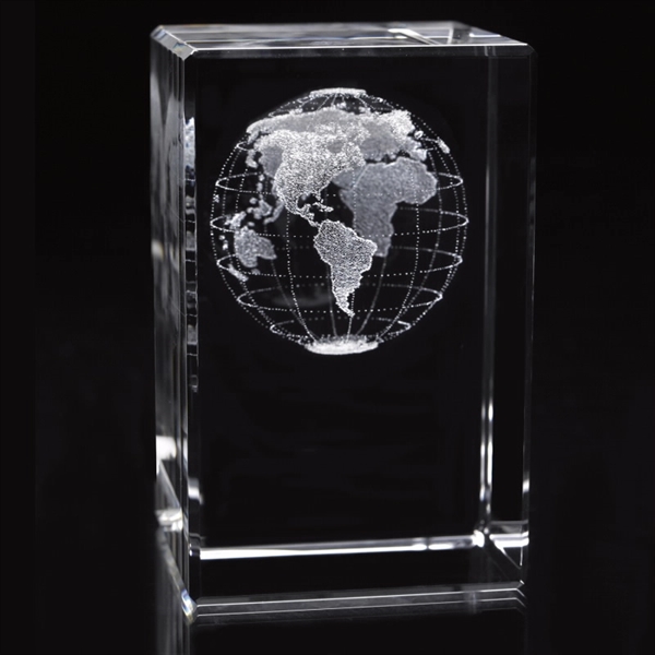 1 15/16″ x 3 1/8″ x 1 15/16″ freestanding clear acrylic award with inscribed globe.
