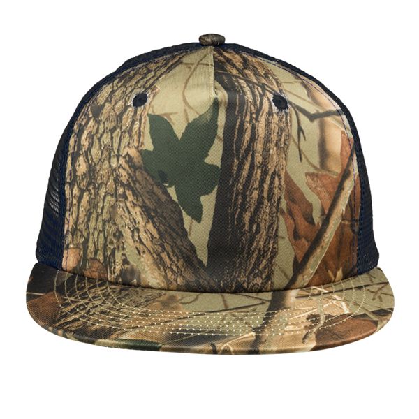 Five panel, structure polyester twill mesh camo trucker cap.