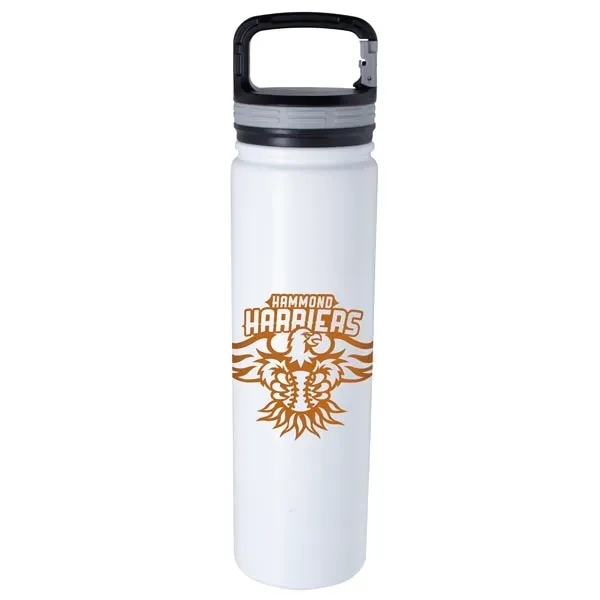 Drink in all of the publicity and exposure you can when you make a gift or giveaway of this handsome sports bottle. This 10 1/8″ x 2 7/8″ vessel is crafted from vacuum-insulated food-grade stainless steel to maintain the temperature of 26 ounce of your favorite hot or cold drinks for hours. Design features include a secure, screw-on lid with a wide mouth for adding ice, handle and carabiner clip built right in! White only. Add your school, sports team, organizational or company logo or message to customize.