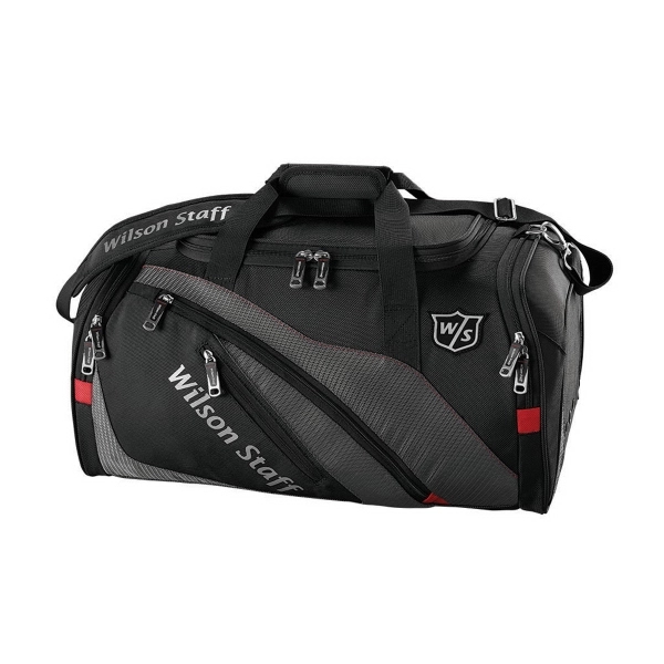 Wilson Staff® Duffel Bag. Wide opening top. 4 zipper pockets. Padded shoulder strap. 10.75″ x 20.25″ x 13″.