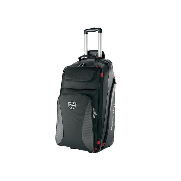 Wilson Staff® Wheeled Bag. Wide opening top. Retractable “pull-and-roll” handle. 5 zipper pockets. 28″ x 14.5″ x 11″.