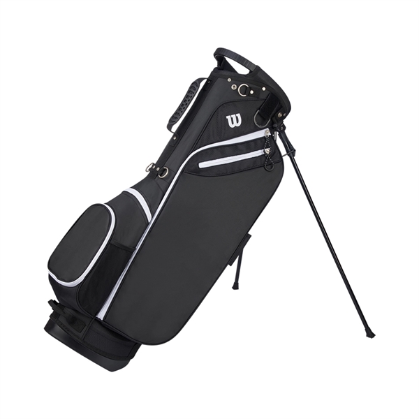 Wilson® W® Carry Golf Bag. Best Seller. 5-way top with 2 full-length dividers, 1 integrated handle. 7 pockets including: 1 large full-length side pocket, 1 valuables pocket, 1 large base accessory pocket, 1 mid-size ball and tee pocket. Umbrella holder, towel ring, rain hood, glove holder.