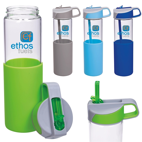 9 1/8″ x 3 3/4″ Yoli Yoga glass and silicone 19 ounce capacity sports bottle with sip-through lid and straw.