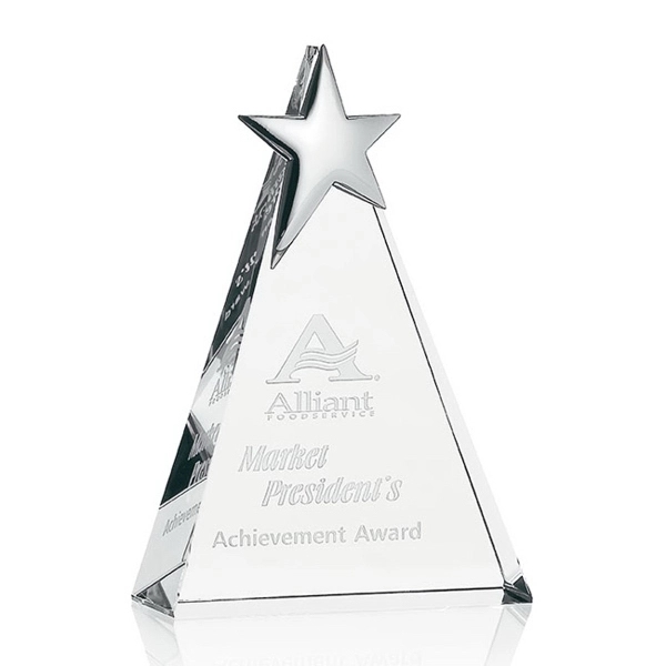 This optical crystal award measures 6 1/2W x 10H x 2D and features a chrome-plated star at the top. A deep-etched or full-color imprint of your recipient’s name and your logo takes center stage on this sleek pointed trophy. This elegant award is ideal for major achievements in any industry.
