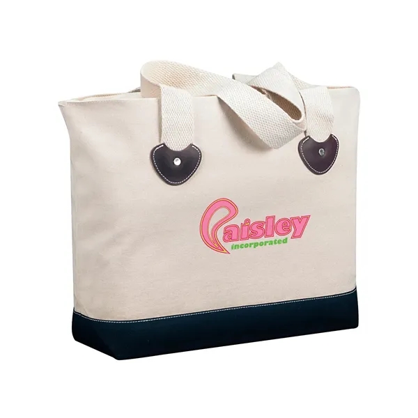 Your company will sail towards success when featuring this marketing tool! Measuring 18 1/4W x 11 1/2H x 5D Zippered Boat Tote features a zip closure, leatherette detail, 28L carry handles and a large gusseted bottom. Each one is made of 15 oz. canvas and the bottom of 10 oz. colored canvas. Add you brand name, logo or message using our customization process to create a fantastic giveaway!